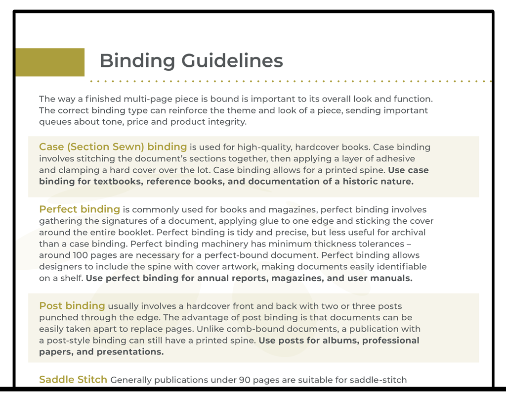 Perfect binding is commonly used for books and magazines, perfect binding involves gathering the signatures of a document, applying glue to one edge and sticking the cover around the entire booklet. Perfect binding is tidy and precise, but less useful for archival than a case binding. Perfect binding machinery has minimum thickness tolerances – around 100 pages are necessary for a perfect-bound document. Perfect binding allows designers to include the spine with cover artwork, making documents easily identifiable on a shelf. Use perfect binding for annual reports, magazines, and user manuals.